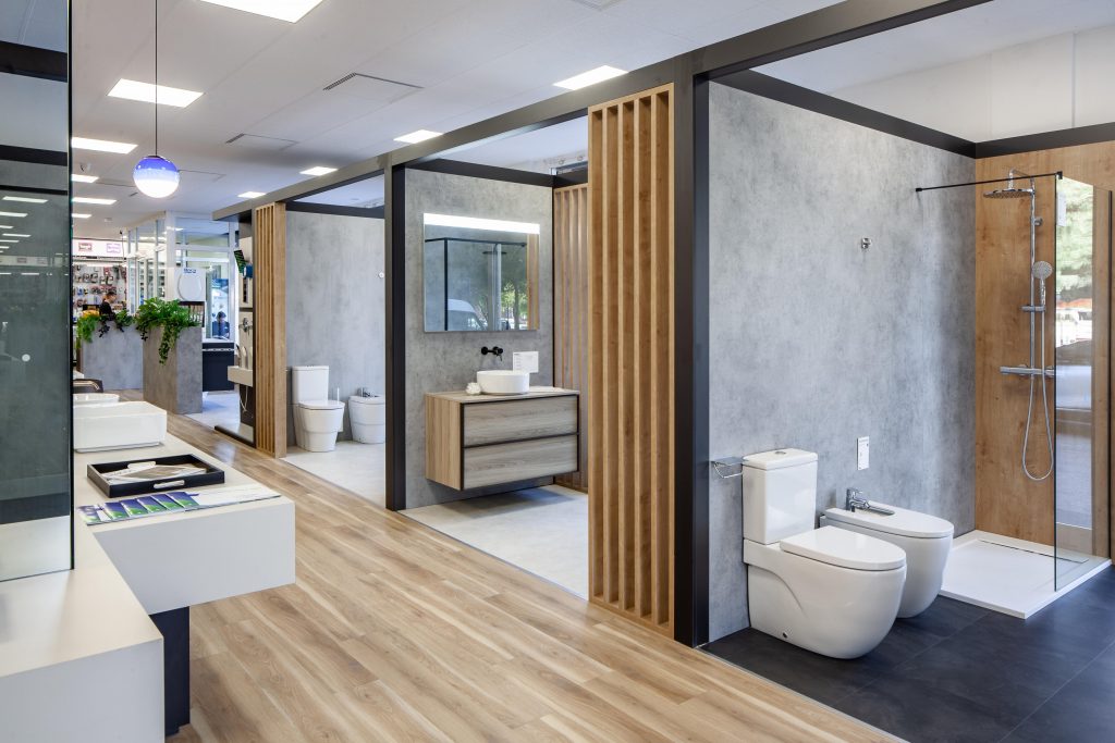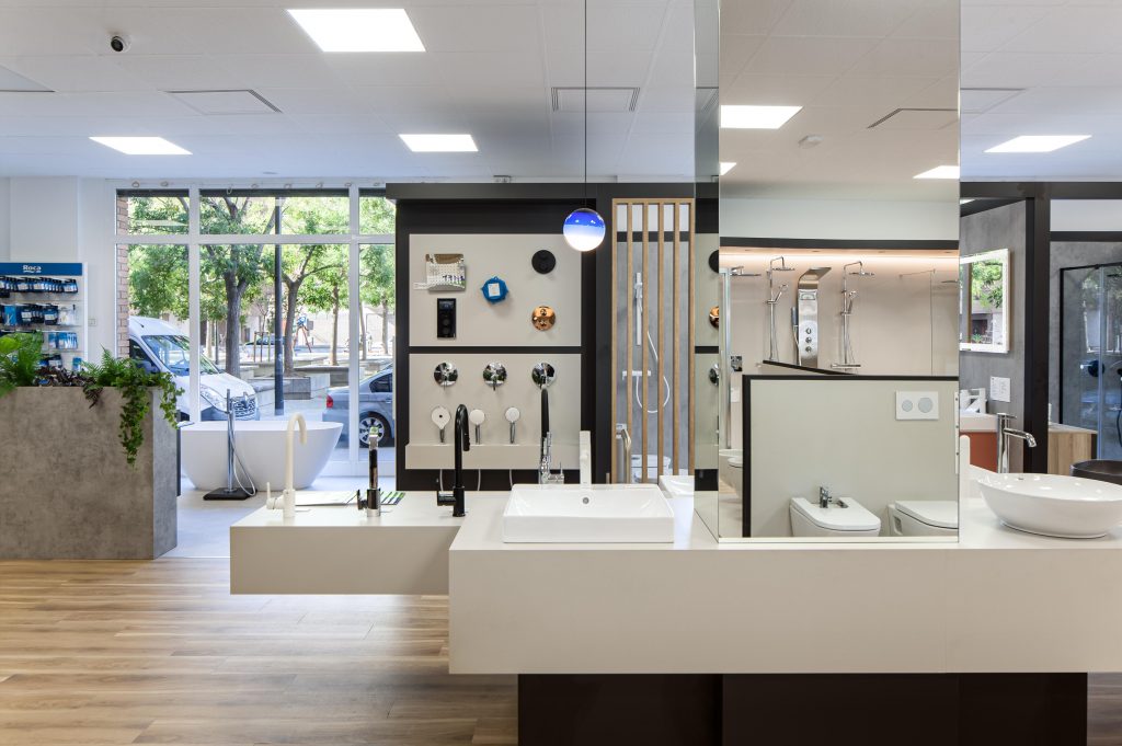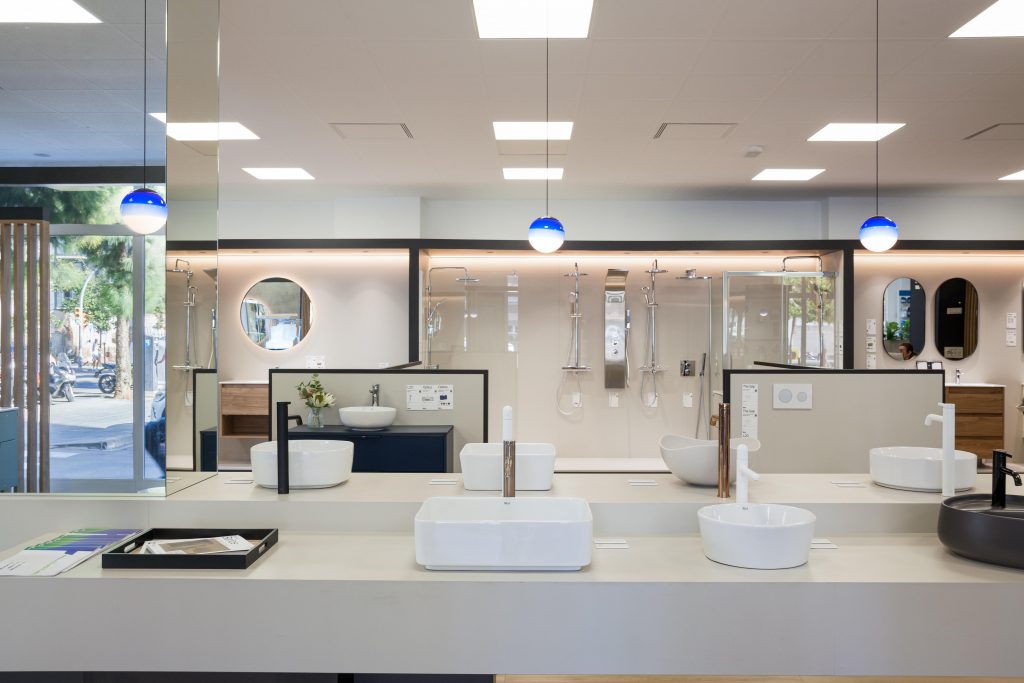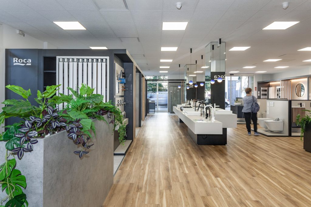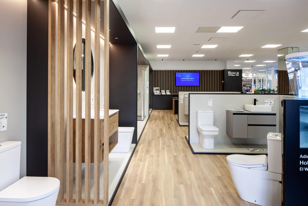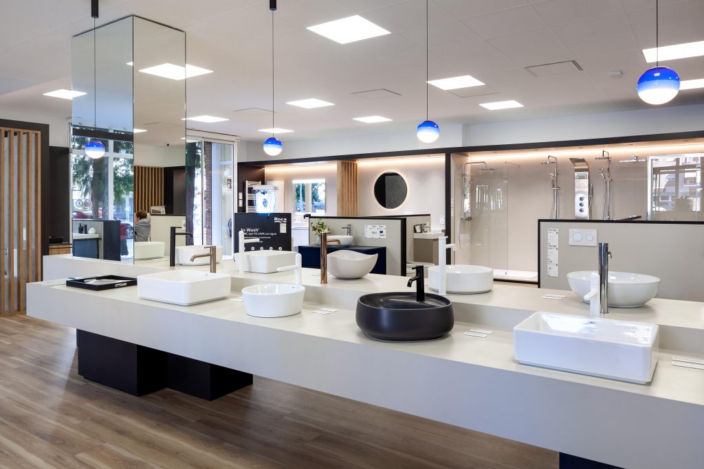 La botiga Roca d’Hidro Tàrraco, planteja l’exposició del producte de més alçada de manera perimetral, com els ambients, col·leccions i mampares i dutxes, i el producte més baix es disposa a la zona central. D’aquesta manera, el client es pot moure amb facilitat i observar tots els productes de forma clara.